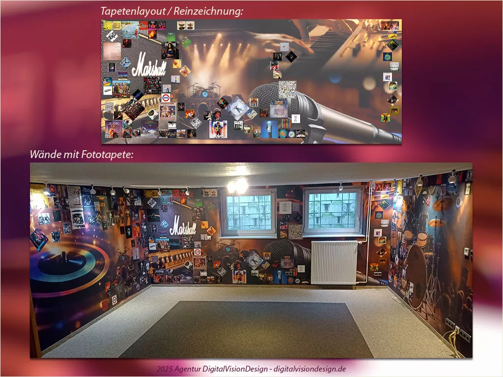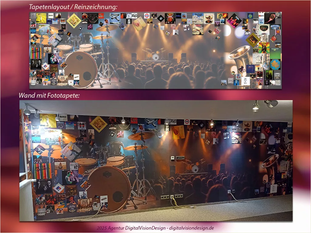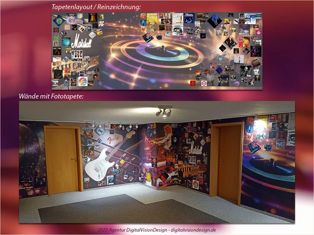 Leistung + Spezifikation: Erstellung von 4 Tapetenlayouts inkl. der Grafikbearbeitung aller abgebildeten Plattencover, Ausarbeitung der konformen Druckdaten (Reinzeichnung), Produktions- und Lieferung (Full-Service von der Idee bis zu den gelieferten Tapetenrollen).